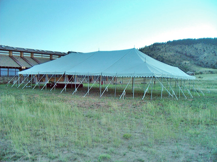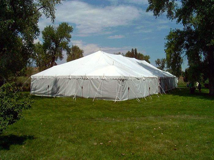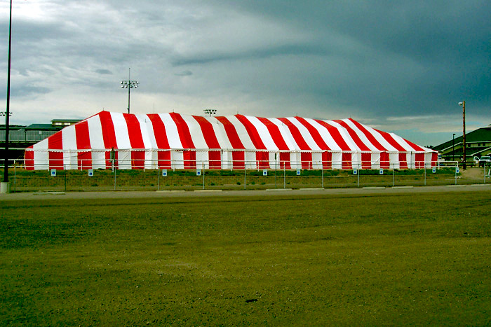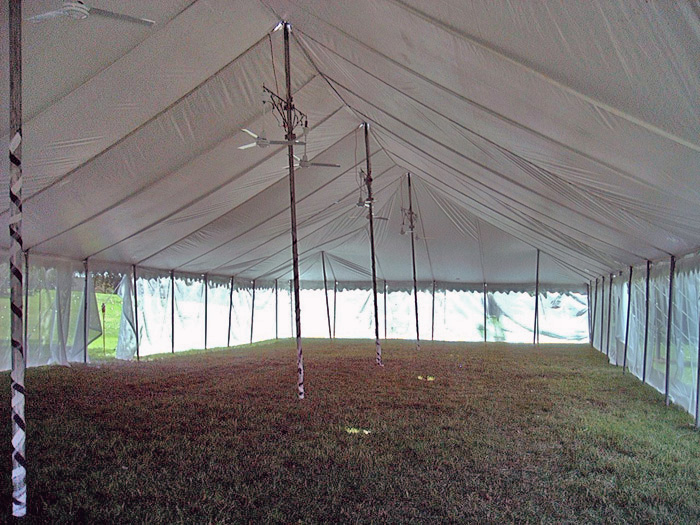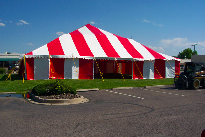 Our Festival tents are a classic rope tent with center poles. Colored Festival tents are a great way to draw attention to your event. They are available in red, blue, yellow or green stripes, or all white. These tents are relatively inexpensive making them a good choice to cover a large area for a short period of time. The sidewalls hang freely on the outside and wrap around the tent in 65' lengths. In addition, these tents require six feet of staking area around the outside of the tent. Many of our accessories can be added to these tents such as lights, fans, or screen walls. Festival tents are commonly used for sales events, fairs, parties, weddings, company picnics.