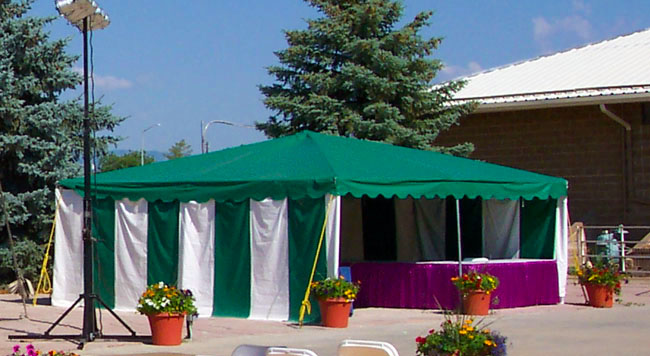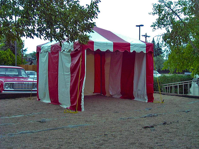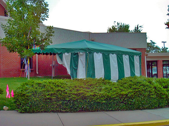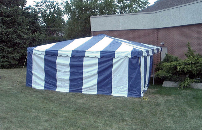 Our Traditional frame tents are a great choice when a smaller tent is needed. They are commonly used for backyard parties, vendor booths at tradeshows, concessions, fairs and to supplement a larger main tent. Like the Unique™ and Super Tents®, they do not have center poles, but that is where the similarities end. Traditional frame tents are made with a pipe frame that the tops are strapped to, and the sidewalls hang freely, wrapping around the outside. They come in all white as well as various striped colors for a more festive look. Furthermore, they only require one anchor at each corner.